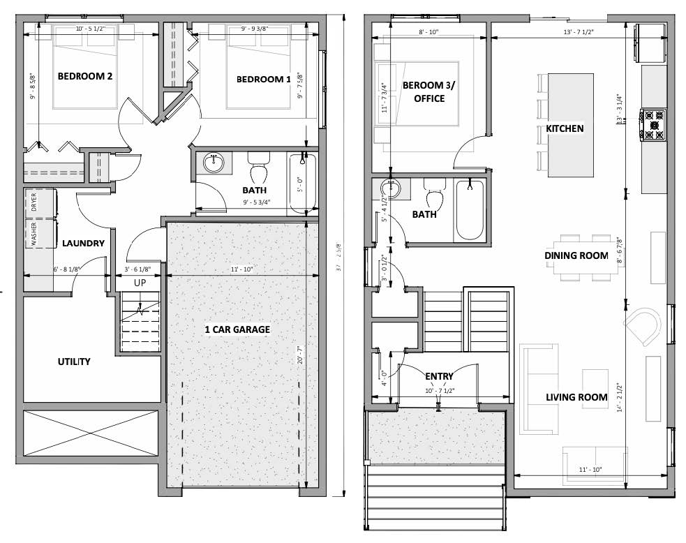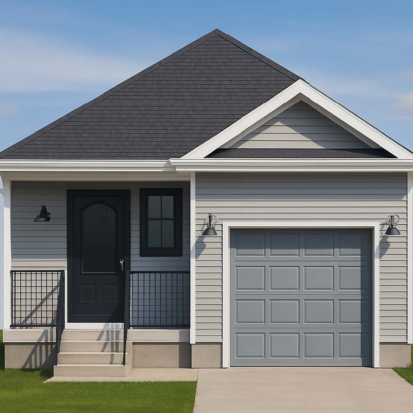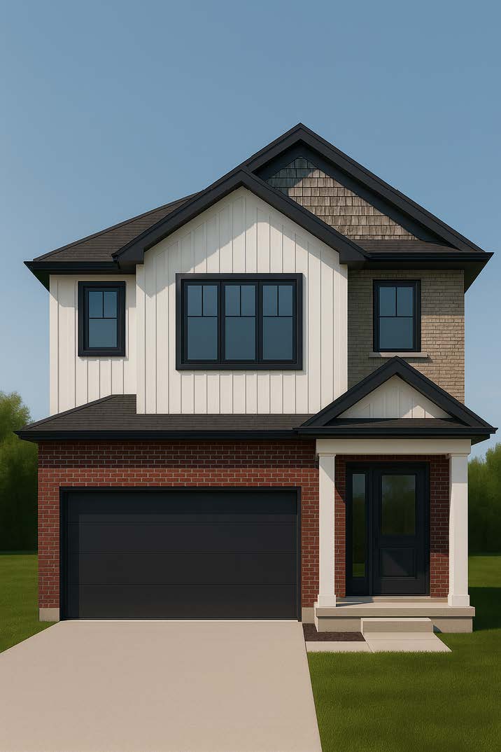 - Vinyl siding – vertical board and batten style on front elevation, horizontal on balance